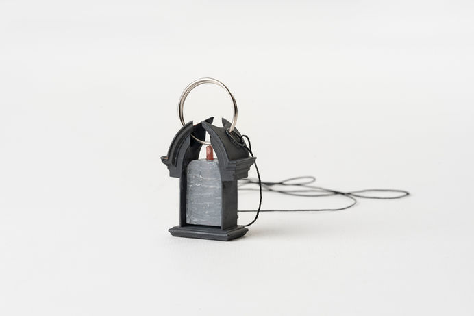 בלב התערוכה נמצאת מטונימיית מפתח: תליון-מחזיק מפתחות שעיצבה האמנית בהשראת חלונותיו המקושתים של הבניין, כשאת הבטון המזויין מחליפה בפרגמנט הזעיר שעווה אפורה – חומר רך, גמיש ומתכלה, המשמש בעת ובעונה אחת כנר זכרון נייד וכביטוי מכמיר-מתריס של תיקון ותקווה. מוצגים נוספים, ביניהם מקבץ של פריטים דקורטיביים וכלי מטבח ועבודה שנוצרו מתוך שטיח שעבר בירושה במשפחתה, לובשים צורה של קמיעות, טוטמים או תְּרָפִים – חפצים מקראיים למשמר הבית – המעלים באוב את הסביבה הביתית שאבדה. אחרים, כדוגמת סיכות בצורת ציפורים העשויות מחרצני זיתים, או גמלי עץ קטנים בסגנון האוריינטליסטי הנמכר לתיירים בעיר העתיקה, מגלמים את הנוף התרבותי והפוליטי של אזורנו, ואת הרבדים השנויים במחלוקת של סמליו ומסחורם.
