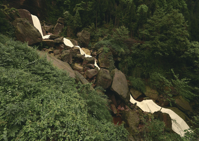 The Foundation for Spirituality and the Arts (FSA) presents "Emei Mountains," a large scroll painting and a performance documentation video by the renowned Beijing and Los Angeles-based artist Bingyi created in 2018 at sacred Buddhistes mountain sites in China as a land and weather project that registers the effects of wind, sun, humidity, air pressure, and terrain with ink and water on bespoke xuan paper.